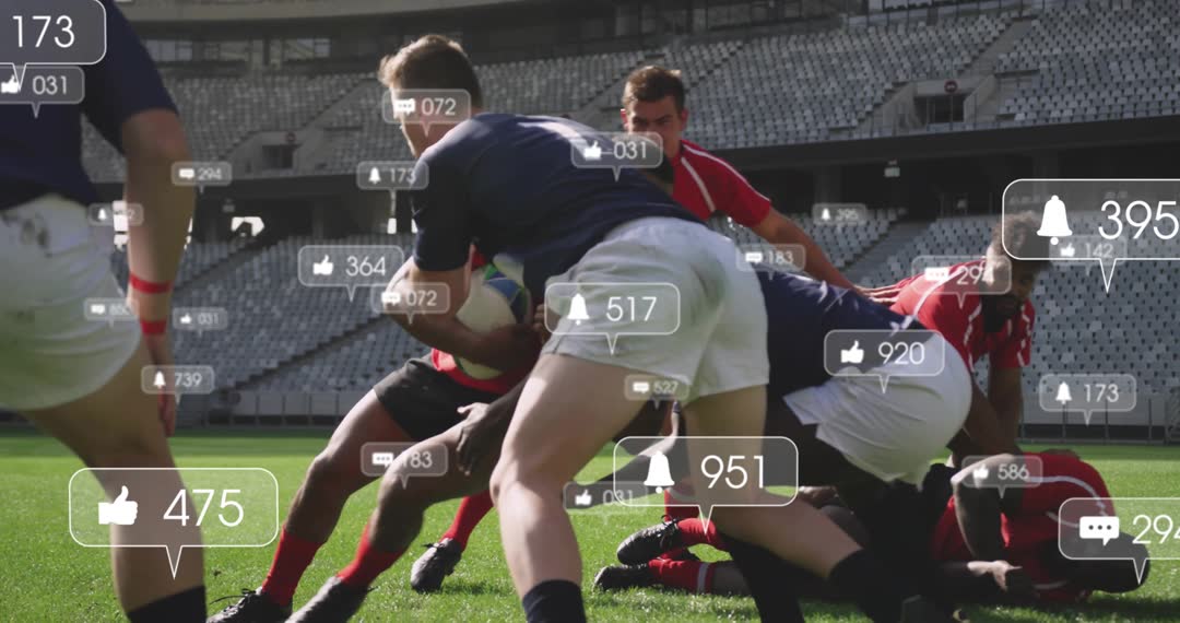 Rugby Players Competing With Social Media Interaction Overlay Video