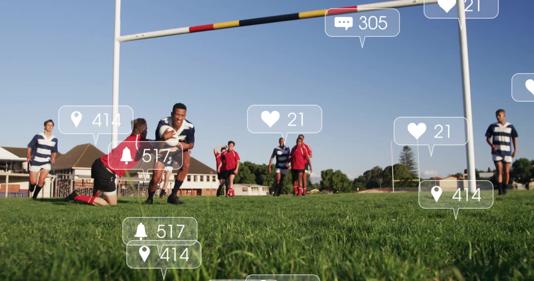 Rugby players in uniforms playing on a grass field with overlay of social media icons indicating various interactions such as likes and comments. This can be used to illustrate concepts of digital collaboration, social media influence in sports, technology integration with real-time updates, and audience engagement during live events. Suitable for presentations on modern sports marketing, technology sports partnerships, and virtual fan experience.