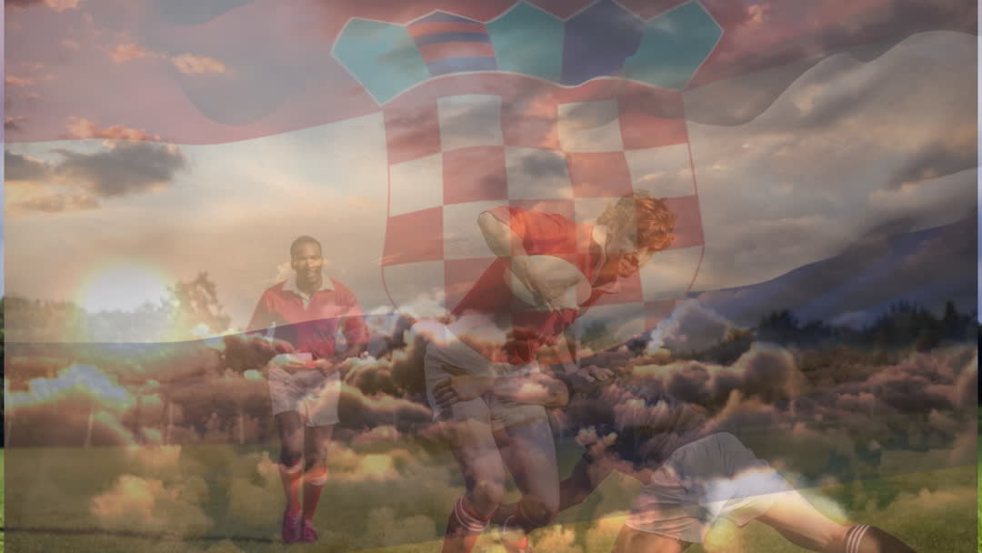 - Rugby Players in Action with Croatian Flag Overlay Dramatic Sunset