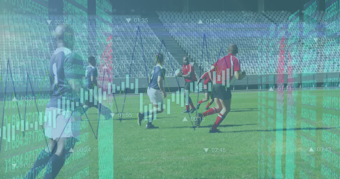 Rugby players engage in action on a grass field at a stadium while a digital data overlay featuring graphs and stock market figures is superimposed. This video merges the themes of sports and technological data analysis, ideal for depicting concepts of performance analytics, tech in sports, or socio-economic perspectives in athletics. Suitable for use in articles, marketing materials related to sports technology, financial trends in athletics, or enhancing graphic content.