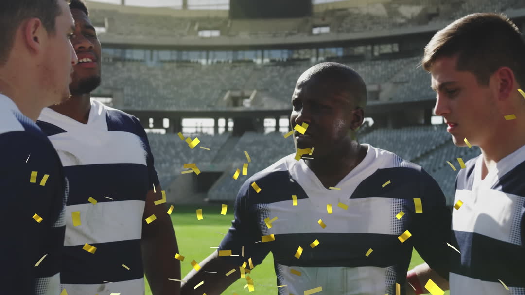 Rugby players gather outdoors in stadium, celebrating victory with enthusiasm while confetti adds festive atmosphere. Image can depict elements like teamwork, success, determination. Suitable for sports events promotions, teamwork concepts, or articles about sportsmanship and achievements in rugby.