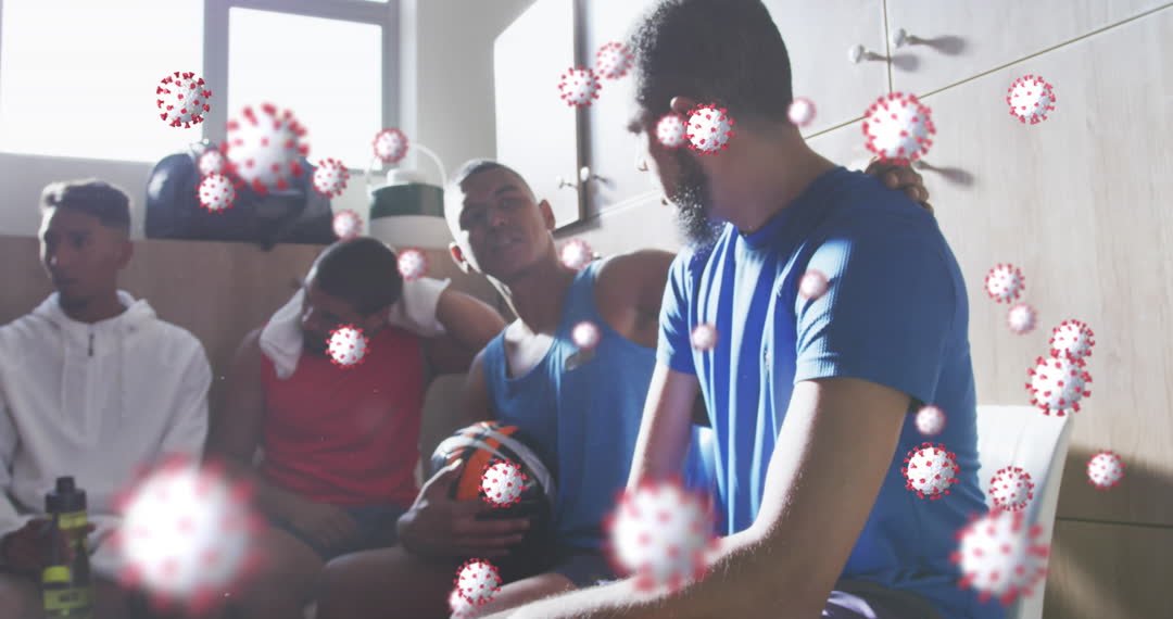 - Rugby Team Discussing with Virus Overlay in Locker Room
