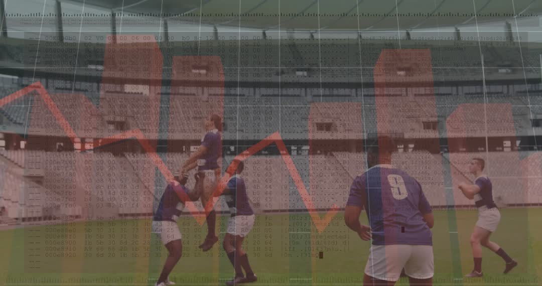 - Rugby Team Practicing Line-Out in Stadium with Data Overlay