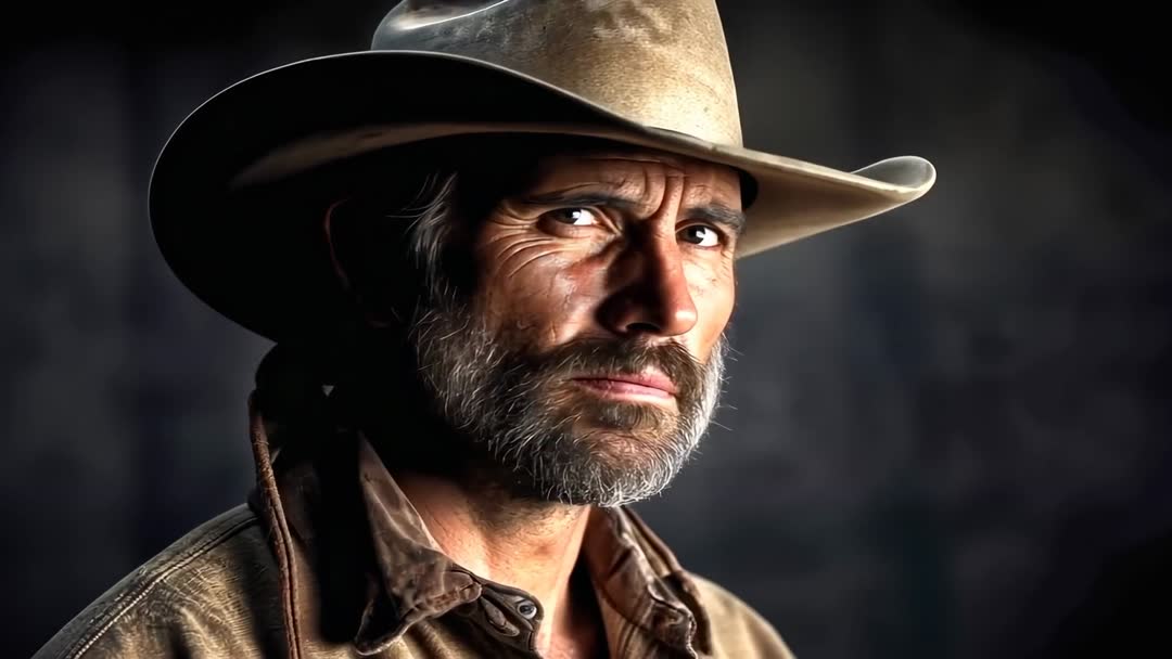 - Rugged Cowboy Portrait with Intense Gaze Against Dark Background