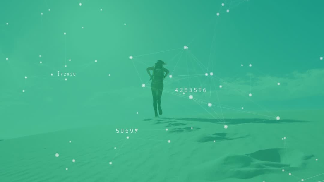 Silhouette of a runner goes over a desert dune with digital data and numbers forming around, indicating performance tracking. The blend of natural environment with digital elements symbolizes the integration of technology in fitness routines. Useful for illustrating articles on fitness innovations, tech-enhanced workouts, or the convergence of health and technology sectors.