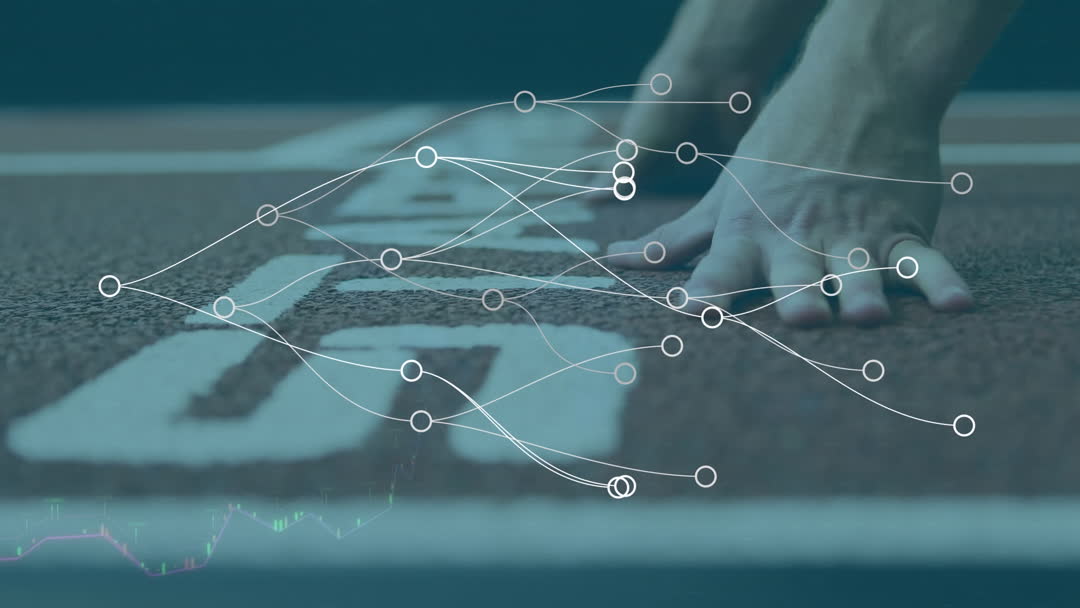 Hands of a runner getting ready to start on a track, overlaid with digital connections and graph lines. This concept videory combines sports with technology and innovation elements. Useful for illustrating athleticism blended with modern data solutions, sports tech advancements, or active lifestyle trends.