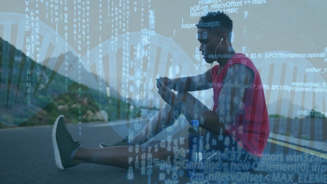 Image features athlete pausing outdoors looking at mobile phone while analyzing performance data with DNA and code overlays indicating integration of fitness technology and personal genomics. Suitable for articles on advanced sports apps, biometric tracking technology, and personalized athlete programs.