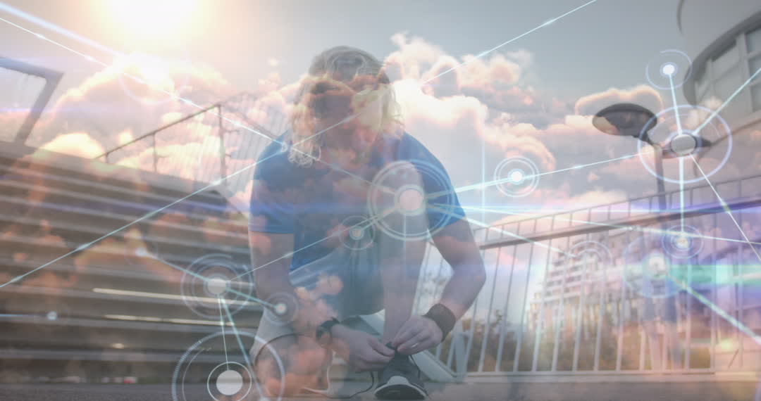 Multiple exposure blend of athletic person tying shoelaces with digital network overlay emphasizes connection between physical health and technology. Ideal for visual content integrating fitness apps, healthy living tips, or connecting physical and digital wellness trends.