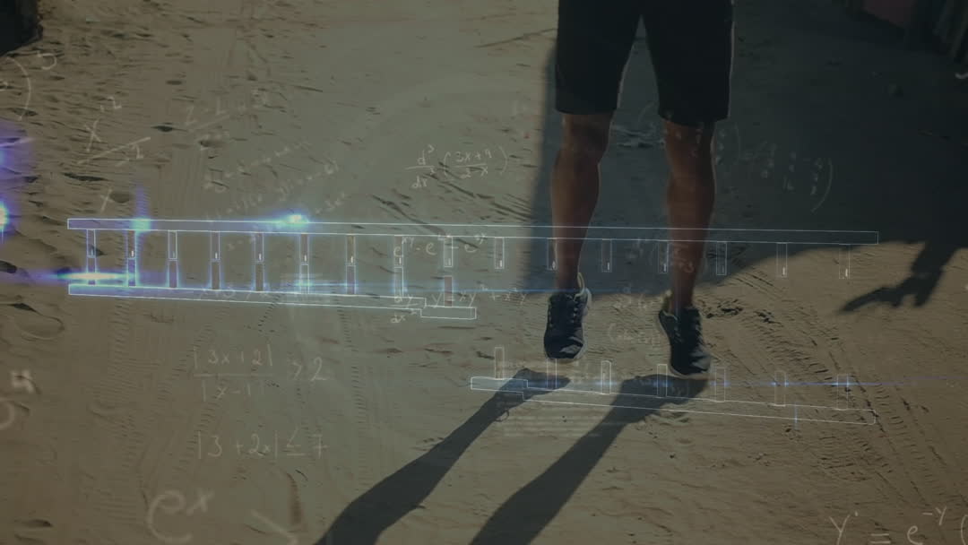 Caucasian man's legs are seen running on a sandy surface, fused with visuals of scientific data and DNA, highlighted against open digital blueprints and numeric annotations. Ideal for illustrating ideas of intersection between physical exercise and scientific monitoring, technological advancement in sports analytics, or health and fitness tracking.