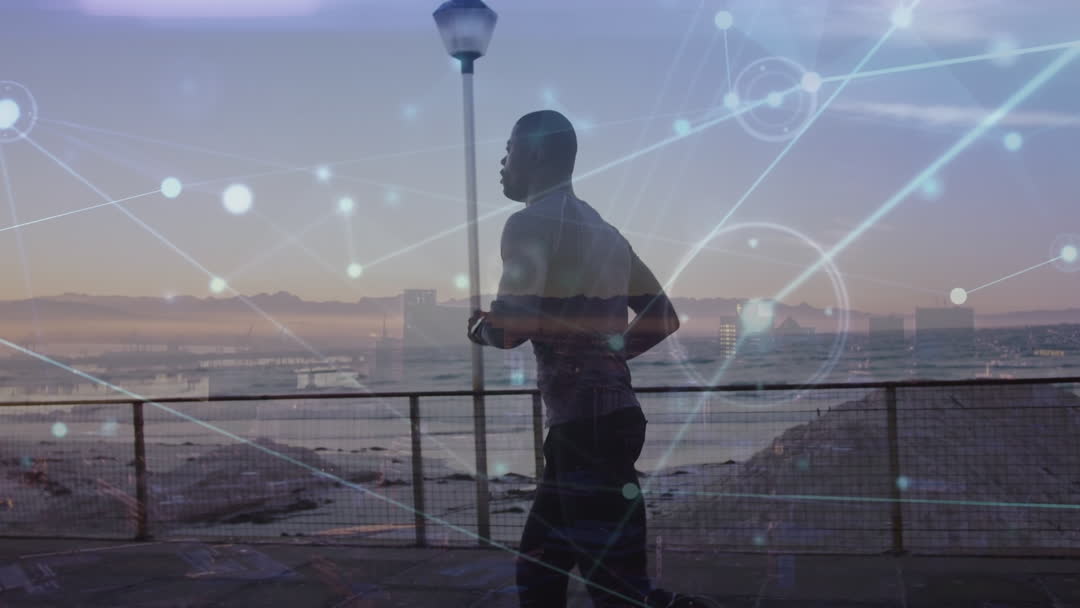 African American man running outdoors at sunset with digital network connections overlay. Background of cityscape and coastline enhancing the technology-themed concept. Ideal for promoting fitness technology, illustrating concepts of connectivity and data in sports, and modern advertising designs emphasizing digital innovation in health.