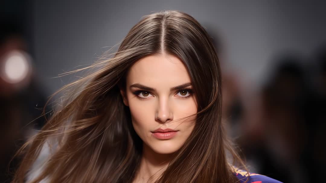 AI Generated Image. Video showing model striding down runway toward camera under bright lights, fan blowing long hair and creating dynamic movement while patterned garment flowing. Close-up frame capturing intense gaze, flawless makeup, sculpted features, runway-ready styling. Serving fashion campaigns, beauty commercials, haircare promotions, runway show coverage, editorial spreads, website hero banners, social media teasers, lookbook reels. Cropping to vertical for mobile reels or to wide format for full-screen hero. Using slow-motion segment for emphasizing hair movement; trimming for loopable background clip; color-grading for warm tones to enhance skin and fabric colors. Targeting fashion magazines, designers, beauty brands, hair stylists, event producers, advertising agencies. Offering high-impact visual for brand storytelling, product demos, and promotional video openers.