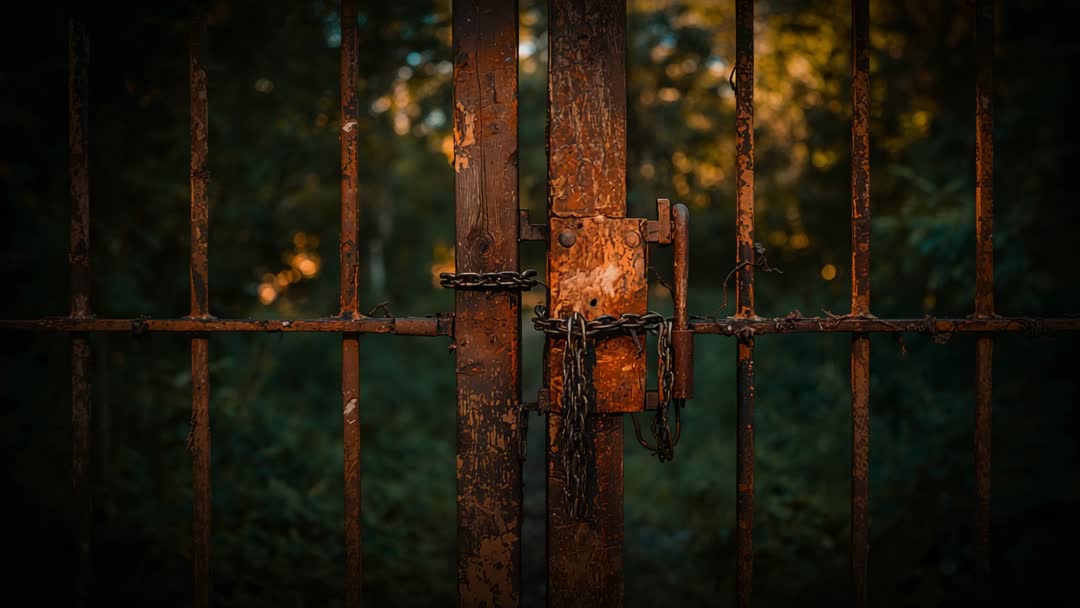 AI Generated Image. Footage showing rusted iron gate standing locked with heavy chain and padlock at overgrown forest entrance during golden hour. Camera panning slowly across peeling paint and corroded metal while warm sunlight filtering through trees, creating glowing highlights and deep shadow contrast, with shallow depth of field producing soft background bokeh. Suiting use as atmospheric opener or cutaway in mystery, thriller, or documentary projects; suiting editorial stories about land access, property security, abandonment, or nature reclaiming infrastructure. Working well for motion graphics backgrounds, title overlays, website headers, social media reels, and promotional trailers. Suggesting cinematic color grade, adding subtle vignette, overlaying text on dark margins, slowing footage for dramatic effect, or looping for ambient background.