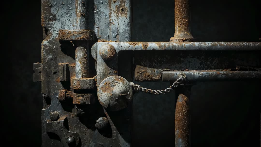 AI Generated Image. Close-up video frame showing rusted iron hatch latch with round knob and short chain, upper-left lighting accentuating flaking paint, pitted metal, and heavy corrosion. Camera panning slowly left to right, revealing layered patina, textured rivets, and worn mechanical details. Color palette combining muted grays, rusty oranges, and deep blacks for moody, cinematic atmosphere. Working well for industrial history documentaries, urban exploration sequences, machinery restoration tutorials, safety and maintenance reports, vintage design projects, website hero banners, editorial spreads, and social media posts focusing on decay and preservation. Consider looping subtle camera movement, adding film grain, boosting contrast and texture clarity, and desaturating highlights to emphasize rust tones. Crop for vertical formats to create dramatic close-ups or widen framing to include surrounding hardware for contextual storytelling.