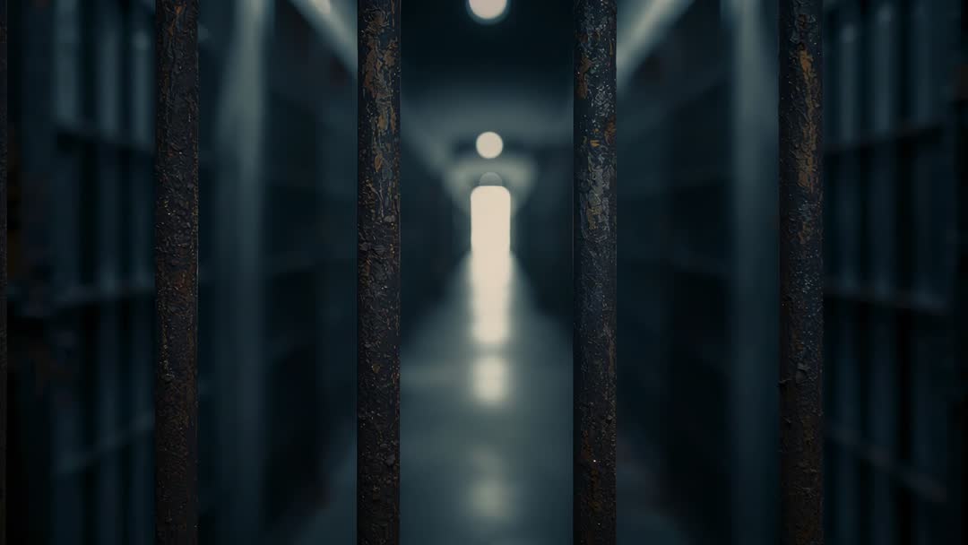 AI Generated Video. Video showing close-up of rusted vertical bars filling foreground while blurred rows of cells recede into dim corridor toward distant exit light. Camera focus pulling toward exit light while foreground bars remain sharp, creating strong sense of confinement, depth, and tension. Mood conveying isolation, institutional decay, and faint hope of escape, with cool color grading and low-key lighting for cinematic look. Useful for documentary and news segments about criminal justice or prison reform, crime and thriller productions, title sequences, website hero clips, campaign visuals, book and album covers, or educational presentations. Footage matching dark cinematic grading and slow push-in motion, usable for transitions, overlays, atmospheric cutaways, and dramatic backgrounds.