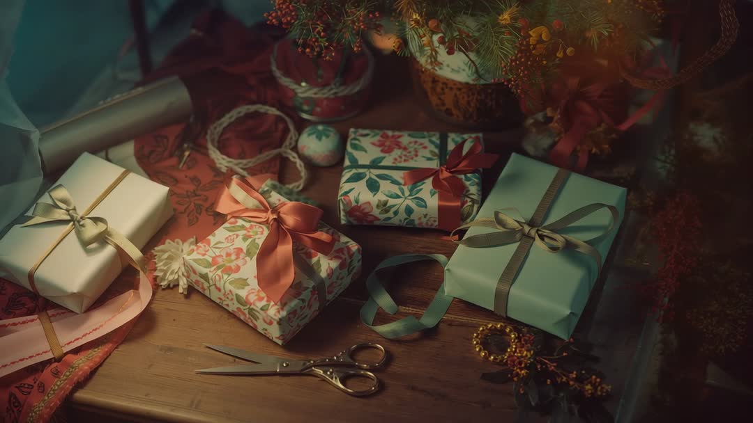 AI Generated Image. Video pans across home craft desk adorned with creatively wrapped gifts, scissors, and twine. The warm lighting and natural decor elements add a cozy and festive ambiance. Ideal for inspiring DIY gift wrapping ideas, seasonal festivities marketing, or showcasing traditional crafts.
