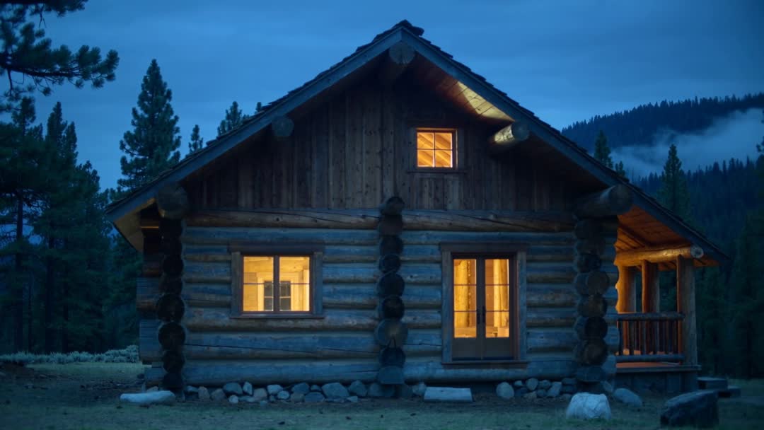 - Rustic Log Cabin at Dusk with Glowing Windows in Serene Wilderness