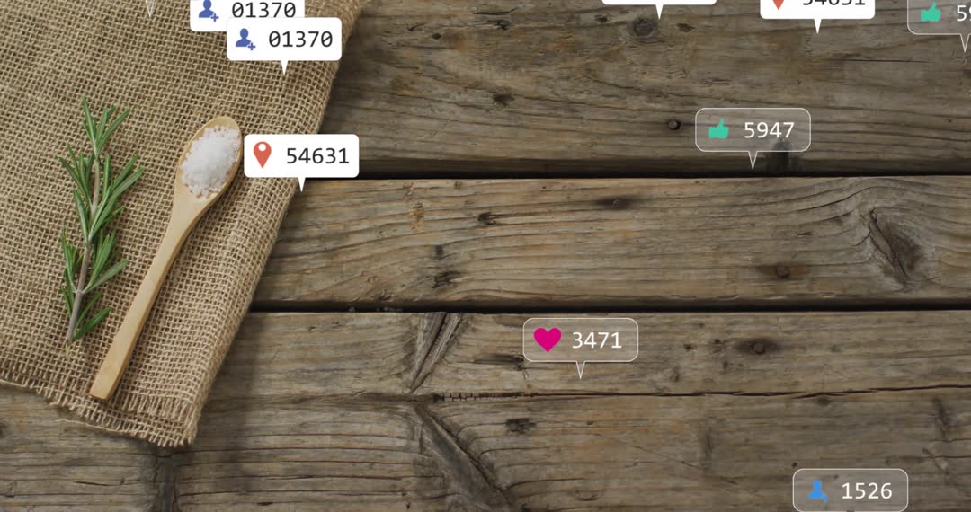 Rustic wooden backdrop featuring a wooden spoon with coarse salt and a rosemary sprig paired with social media icons. Topics include digital interactions and culinary presentation, suitable for discussing modern communicative processes and enhancing food photography atmosphere. Perfect for use in blogs about food styling, social media graphics, or presentations on digital engagement.