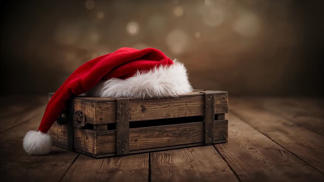 AI Generated Image. Video showing rustic wooden crate topped with red Santa hat and fluffy white pompom sitting on weathered plank floor with warm bokeh lights in background. Camera panning slowly or holding tight focus on wood grain and hat texture, creating cozy, cinematic mood with warm tones and shallow depth of field. Useful for holiday promotional videos, seasonal product presentations, gift guide visuals, festive social media reels, website hero banners, greeting card animations, retail signage, TV commercial backgrounds. Easy to loop for background clip or to layer text and logo over out-of-focus area. Suitable for winter campaign, craft market promotion, home decor features, DIY gift wrapping tutorials. Video delivering calm, nostalgic holiday atmosphere and clear center composition for copy placement.
