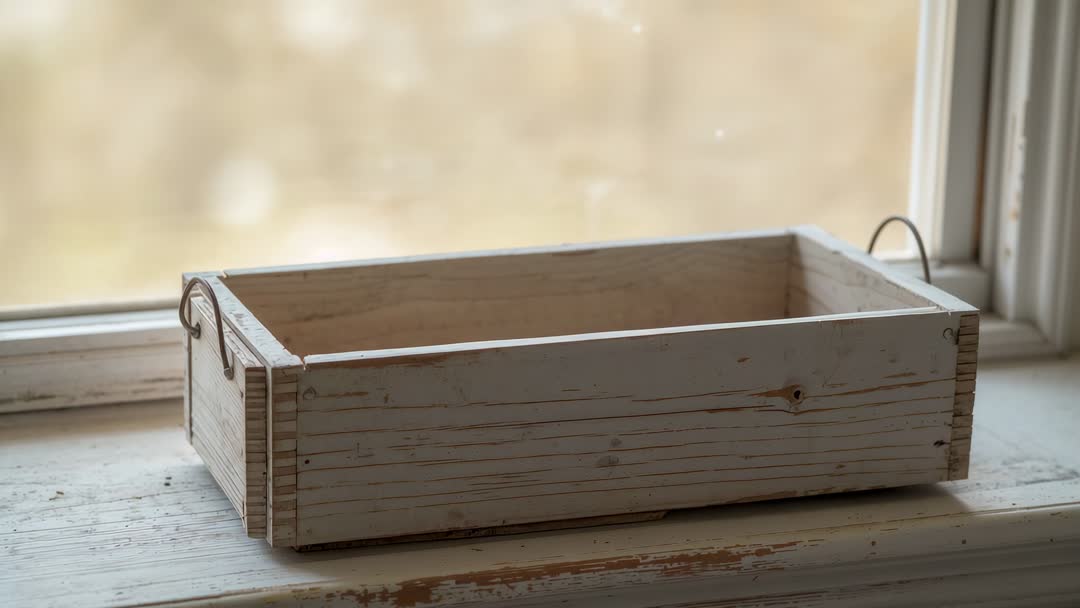 - Rustic wooden planter box with dovetail joints sitting on sunlit window sill, dust motes drifting