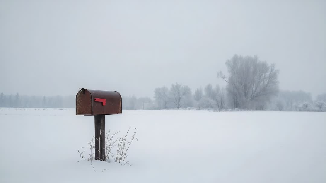 AI Generated Video. Video showing rusty mailbox standing alone in expansive snowy rural field under overcast sky. Red flag down while frost coating mailbox and surrounding grasses, creating quiet minimal winter mood. Frosted trees forming soft background silhouette and horizon receding into muted tones. Composition leaving generous negative space for text overlay, titles, and branding. Footage suiting website headers, hero banners, editorial illustrations for winter postal delays, seasonal greeting cards, social media campaigns, commercials, and documentary b-roll. Color palette featuring muted blues, soft grays, rusty brown and red accent, matching winter marketing and editorial projects. Ideal for travel blogs, rural lifestyle stories, environmental features, advertising for postal services, cold weather preparedness articles, and gallery prints. Clip offering slow cinematic pacing or loop-friendly static shot for background ambience and mood-driven storytelling.