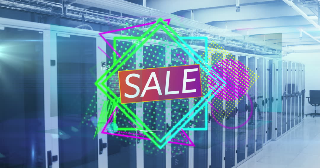 Vibrant sale banner superimposed on an video of a modern server room with neon geometric shapes. Ideal for technology and retail promotions, emphasizing digital sales and discounts in online or tech industries. Eye-catching graphic suitable for marketing campaigns and advertisements targeting tech-savvy audiences.