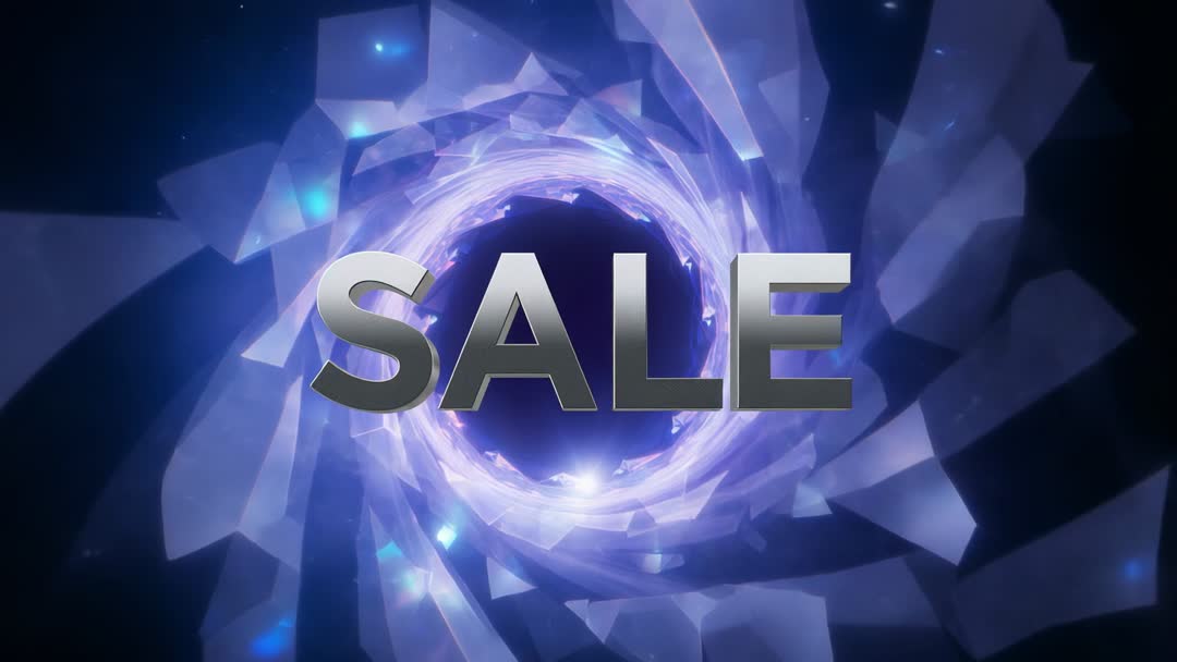 AI Generated Image. Looping 3D video showing metallic SALE letters anchored inside pulsing crystal vortex. Central core pulsing, pulling translucent shards into rotating ring while blue and violet glow illuminating beveled text. Visual conveying urgency, futuristic luxury, high-energy promo tone ideal for sale announcements. Use for retail sale campaigns, online ads, TV commercial openers, social media stories, website hero banners, in-store screens, email headers, event countdowns. Suggestions for customization: replacing SALE text with custom headline or logo, overlaying discount copy and countdown timer, adjusting color grade to match brand palette, adding sound design and bass hit for impact. Deliverables recommendation: seamless loop version for 5-15 second spots, 4K render suitable for broadcast and digital platforms, compatible with motion graphics templates and video editors for fast branding and deployment.
