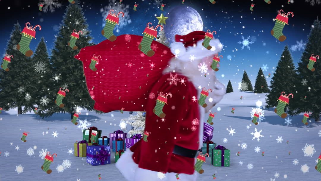 This animated scene features Santa carrying a sack filled with gifts across a snowy, winter landscape under a moonlit night. Surrounded by falling snow and decorative stockings, it captures the magical essence of Christmas tradition. Perfect for holiday greeting cards, Christmas-themed videos, and festive marketing materials.