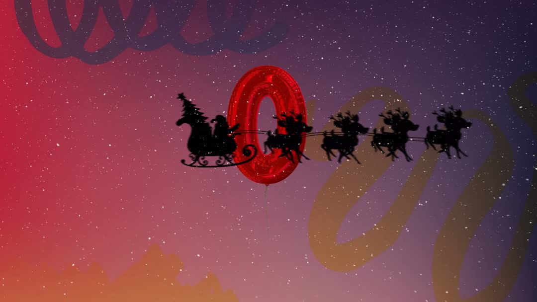 Scene shows silhouette of Santa Claus and reindeer pulling sleigh across nighttime sky with red foil balloon shaped as zero. Festive videory suits holiday greetings, digital decorations, or online festive content during Christmas season.