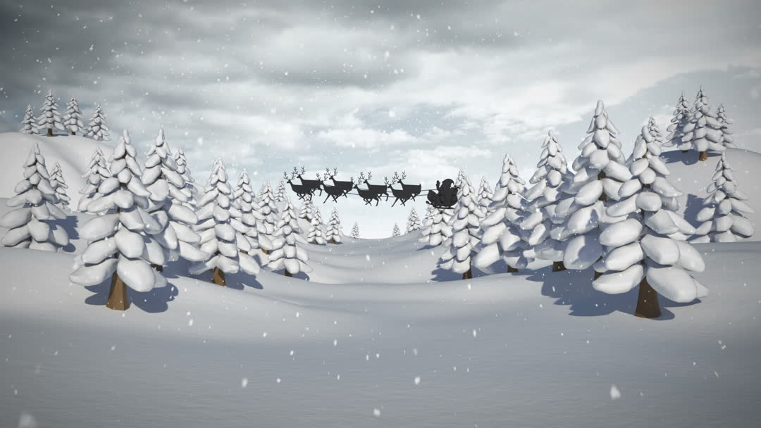 Silhouette of Santa Claus and reindeer flying over a tranquil snowy forest in winter wonderland. Perfect for festive newsletters, animated holiday greetings, winter-themed commercial campaigns, and digital seasonal cards.