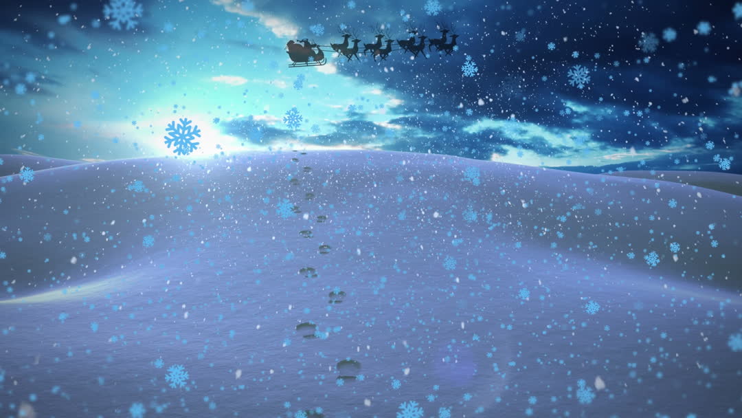An enchanting winter scene with Santa Claus flying across a snowy landscape in his sleigh pulled by reindeer, lit by the moonlight. Suitable for Christmas cards, holiday advertisements, promotional banners for festive events, or storytelling backdrops. A perfect choice for seasonal greetings, children’s animations, or creating a festive mood.