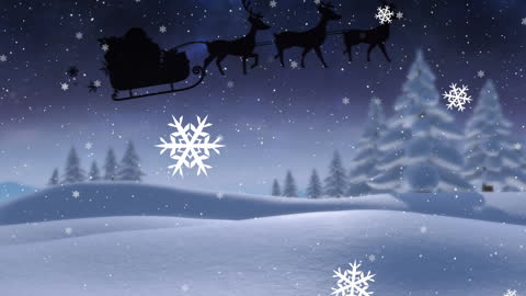 Silhouette of Santa Claus in a sleigh pulled by reindeer soaring over a calm snow-covered landscape during a starry winter night. Dreams of Christmas magic interspersed with falling snowflakes create charming nostalgia, ideal for holiday and festive greetings cards, winter scene animations or social media posts celebrating traditional Christmas spirit and magic.