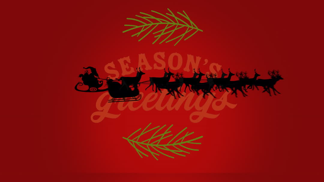 Silhouette of Santa Claus in a sleigh pulled by reindeer crosses a red snowy background with the message 'Season's Greetings'. Perfect for holiday card designs, festive party invitations, seasonal promotions, wallpapers, and digital greetings, capturing the magic and warmth of the holiday season.