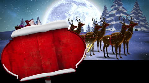 Animated scene of Santa Claus with his sleigh and reindeer flying across a snowy winter landscape under a luminous full moon. A red signboard ready for customized messages adds a festive touch. This video could enhance holiday promotions, greeting cards, or party invitations by providing a charming, nostalgic Christmas element.