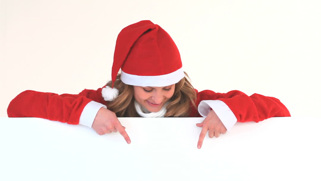 This video features a young blonde woman wearing a Santa Claus outfit, including a Santa hat, while pointing down at a blank white cardboard. Her cheerful expression makes this video perfect for holiday marketing materials, festive season announcements, or Christmas promotions deploying a playful tone. The space underneath allows for adding customized text or seasonal messages.