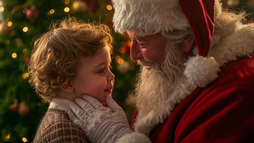 - Santa cupping child's cheeks whispering tender holiday moment by Christmas tree