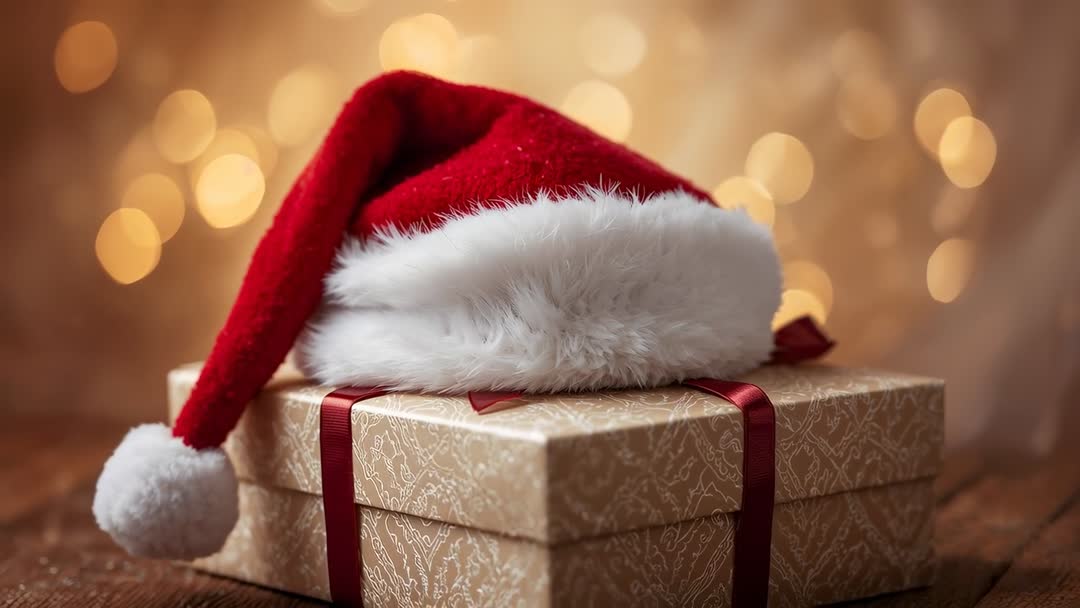 AI Generated Video. Video showing close-up of gold patterned gift box topped by plush Santa hat and tied with red satin ribbon, warm bokeh lights creating cozy holiday mood. Camera focusing on texture of fur trim and embossed wrapping paper while shallow depth of field producing soft golden highlights. Useful for holiday marketing, ecommerce banners, seasonal social media ads, greeting card animations, and gift guide videos. Suitable for background behind text overlays, title screens, product reveal sequences, store window displays, and YouTube intro clips. Color palette featuring warm golds and reds, working well with festive typography and promotional overlays to evoke luxury and celebration.