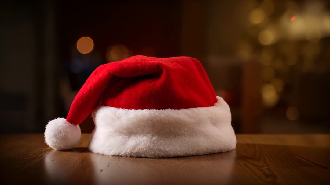 AI Generated Video. Video clip showing red Santa hat with white fur trim and pom-pom resting on polished wooden table with warm out-of-focus lights in background. Composition using shallow depth of field and soft bokeh, creating cozy holiday mood and cinematic atmosphere. Useful for holiday promotions, intro/outro for seasonal videos, social media reels, greeting card backgrounds, retail website hero banners, hospitality signage, and television ad transitions. Clip working well as loopable background or underlay for overlaid text and logo; color grading allowing seamless integration into warm-themed campaigns. Shot featuring natural reflections on wood surface and smooth ambient lighting, supporting minimal and elegant visual storytelling.