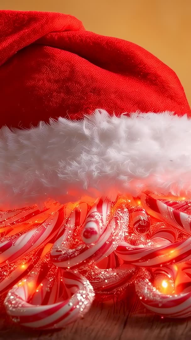 AI Generated Video. Vertical holiday clip showcasing plush red Santa hat resting over pile of striped candy canes on rustic wood table, pulsing warm LED lights threading through candy and creating glowing highlights and soft bokeh. Close-up framing and shallow depth of field emphasizing texture of faux fur and glossy candy stripes, rich red and white palette producing cozy seasonal mood. Serving as looped background for mobile-first content, working well for social media reels, Instagram stories, TikTok backgrounds, website hero banners, email headers, gift guide layouts, and seasonal product promos. Adding text overlay or animated sale badge in upper area without obscuring focal detail. Offering easy color grading for warm or cool holiday campaigns and pairing with festive music or voiceover for greeting messages, event invites, or retail promotions.