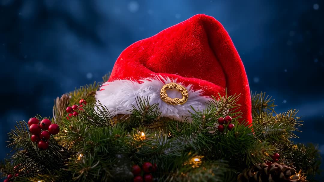 AI Generated Video. Showing red velvet Santa hat gently nestling into evergreen wreath while soft snowflakes falling and warm fairy lights twinkling against night sky. Close-up footage highlighting white fur trim with gold ornamental ring, pinecones, holly berries and frosty needles, rich texture and vivid red contrast. Mood conveying cozy holiday nostalgia, classic Christmas color palette and subtle bokeh. Suitable for holiday marketing, seasonal social media campaigns, website banners, greeting card animation, retail signage, product packaging, television ad overlays and background for holiday countdown videos. Recommend using slow pan or subtle zoom for cinematic feel, adding gentle orchestral music or sleigh bells, overlaying holiday greeting text in upper left or lower third to preserve focal wreath.