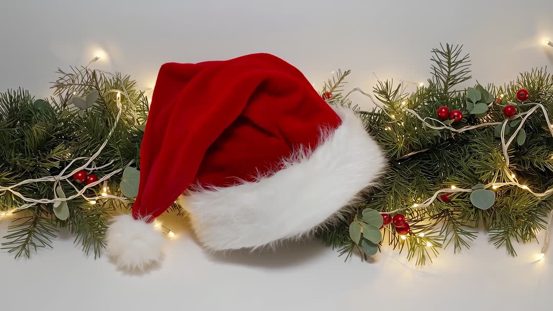 AI Generated Video. Showing short video loop of Santa hat settling onto lush evergreen garland decorated with twinkling warm-white lights and glossy red berries. Camera focusing on closeup details of soft fur trim, fabric folds, and gentle light reflections. Lighting creating cozy warm glow and soft bokeh for seasonal mood. Working well for holiday intros, social media reels, email headers, web banners, in-store screens, and product promotion videos. Providing space on neutral surface for overlay text, logo, or call-to-action. Supporting Christmas marketing, greeting card animation, DIY decor tutorials, and lifestyle blog headers. Looping motion making smooth background for countdowns, playlists, and seasonal displays. Color palette featuring rich red, deep green, warm white, and muted eucalyptus tones.