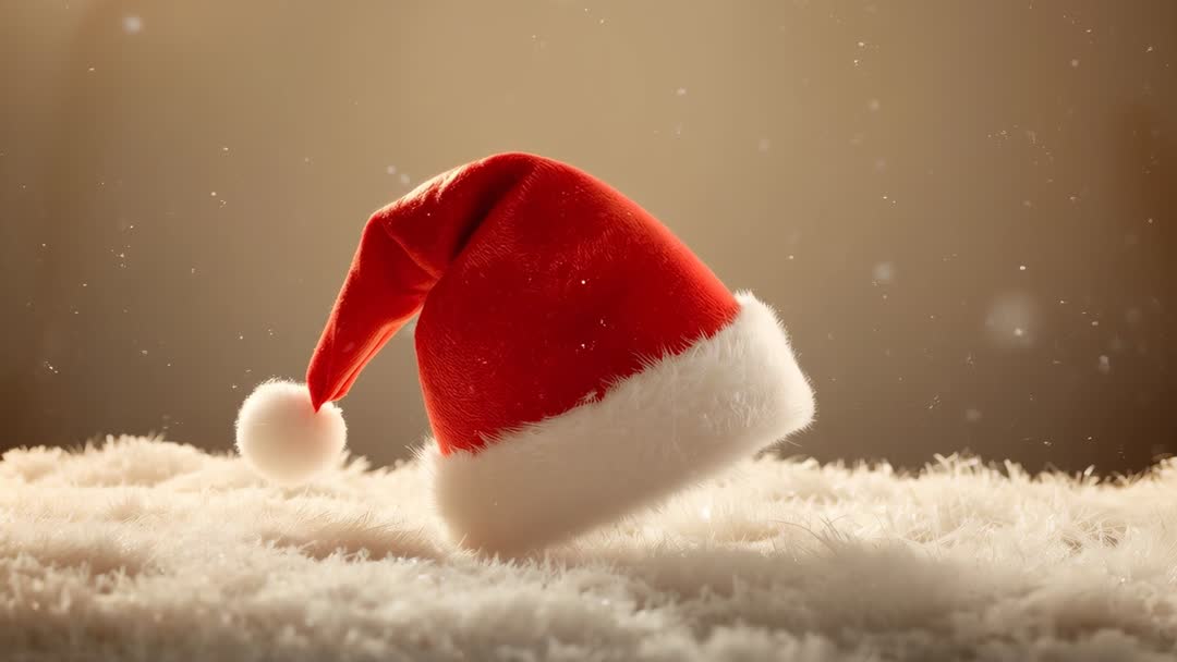 AI Generated Video. Frame showing red Santa hat settling on snowy tabletop while soft snowflakes drifting through warm bokeh light, velvet fabric and fluffy fur trim catching gentle highlights. Scene evoking cozy holiday mood and nostalgic winter charm, offering calm, inviting atmosphere for seasonal storytelling. Ideal for use in holiday advertising, website banners, email headers, social media reels, greeting cards, product packaging, store signage, seasonal posters, and festive backgrounds for video overlays. Composition offering generous negative space for headline or logo placement at upper or left areas; recommend cropping to landscape or square for different platforms. Suggest color grading to deepen reds and warm tones, adding subtle looped motion to falling snow for short clips. Useful as background for copy, countdowns, promotional overlays, and animated holiday greetings.