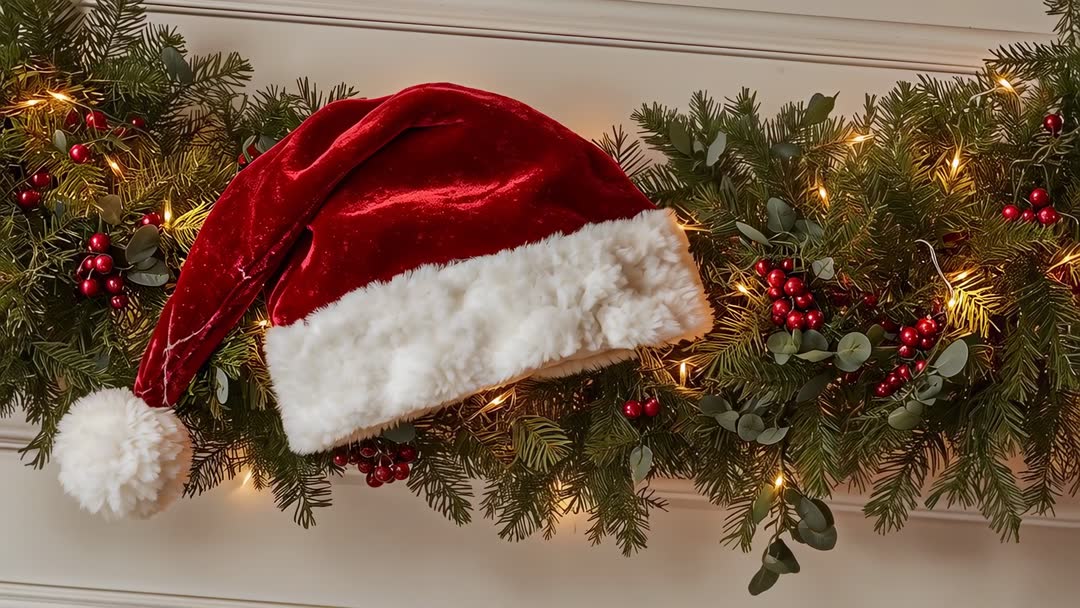 AI Generated Video. Frame from video showing red velvet Santa hat sliding across evergreen garland lit by warm twinkling lights on mantel. Close-up pan capturing fuzzy white trim, pom-pom swaying, glossy red berries, eucalyptus sprigs, soft bokeh glow. Motion feeling creating through gentle camera nudging, suiting short loop or hero background. Serving holiday marketing, supporting seasonal social media posts, powering online store banners, enhancing digital greeting cards, elevating email campaign headers, complementing TV and web commercials, looping for in-store displays, illustrating DIY decor tutorials. Offering overlay space on left and right for headline or product placement. Color palette featuring deep red, forest green, warm gold, neutral mantel tones, easy to match with festive graphics. Deliverable suggestions including 4-8 second loop, 24-30 fps, gentle stabilization for smoother motion, optional color grading for vintage or cinematic look. Including AI-generated tag in metadata if required.