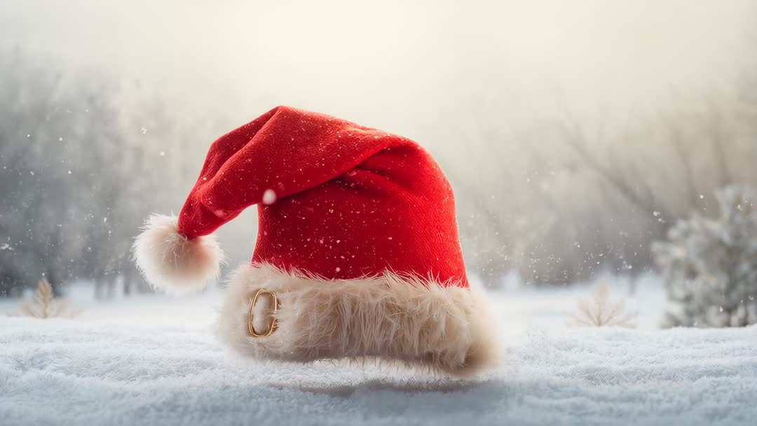 AI Generated Image. Video showing red Santa hat swaying on snow-covered meadow while gentle snowflakes falling and frosted trees blurring in background. Camera performing slow push-in with shallow depth of field, warm backlight catching fur trim and buckle glinting. Clip working well as loop for holiday banners, website hero backgrounds, social media reels, retail signage, greeting card animation, seasonal product promos. Suggested use includes pairing with soft instrumental music, adding subtle title text in upper-right or upper-left to preserve composition, applying gentle vignette and warm color grade to enhance cozy mood. Suitable for marketing campaigns, e-commerce seasonal pages, blog headers, event invitations, TV spots and in-store displays.