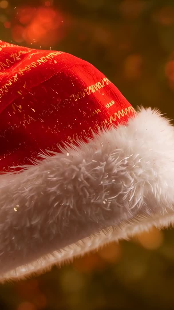 AI Generated Video. Close-up vertical video showing red velvet Santa hat tilting and revealing plush white fur trim with shimmering gold stitching against warm holiday bokeh. Velvet texture and individual fur fibers appearing in high detail, creating cozy and tactile festive mood. Motion delivering smooth tilt ideal for loopable clips and short-form vertical content. Use for social media stories, Instagram reels, TikTok holiday posts, website hero banners, email headers, retail promotions, seasonal ads, greeting video backgrounds, YouTube intros, and digital signage. Leave space in upper frame for overlay text, logo, or call-to-action. Suggested edits: boost warm tones, add soft glow and subtle particle sparkle, pair with gentle sleigh-bell or piano track for emotional impact. Provide multiple uses across holiday campaigns, product pages for apparel and accessories, in-store displays, and themed event invitations.