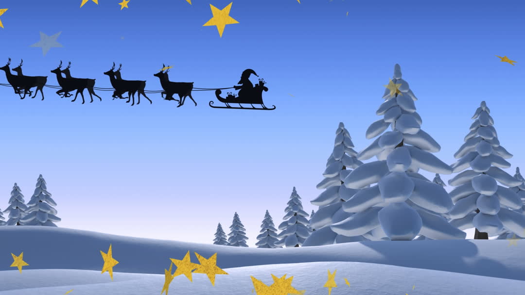 - Santa's Sleigh Flying Over Snowy Landscape with Falling Stars