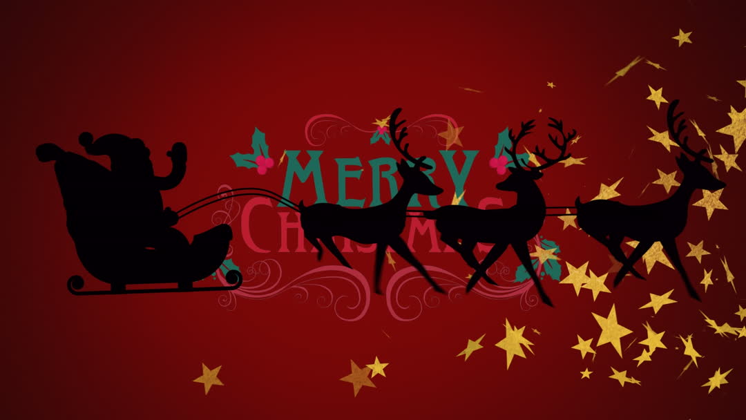 Silhouette of Santa Claus in a sleigh led by reindeer across a Merry Christmas text on a vibrant red background with scattered stars. Ideal for holiday advertisements, festive greetings, social media posts celebrating Christmas, or seasonal video use highlighting festive cheer.