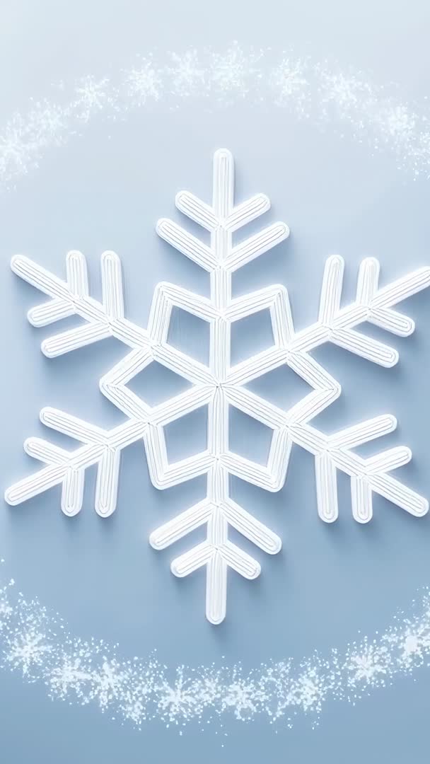 AI Generated Video. Vertical looping video showing large white snowflake scaling gently against pale blue gradient while sparkling particles rising from bottom and forming bright halo ring. Embossed ornament casting soft shadow and glowing edge, creating elegant 3D effect. Motion offering seamless looping, suiting mobile-first platforms and vertical displays. Ideal uses: holiday social media reels and stories, mobile wallpapers, seasonal app backgrounds, website hero animations, digital signage, e-card intros, promotional vertical ads, event invitation loops. Space leaving for headline and logo overlays, color palette matching winter brand campaigns and festive promotions. Editing tips: adjusting particle density, changing hue to match brand colors, adding soft chime or snow sound effect, extending loop with subtle scale variation. File suggestions: providing MP4 and GIF versions, offering 1080x1920 and 4K vertical resolutions for high-quality playback.