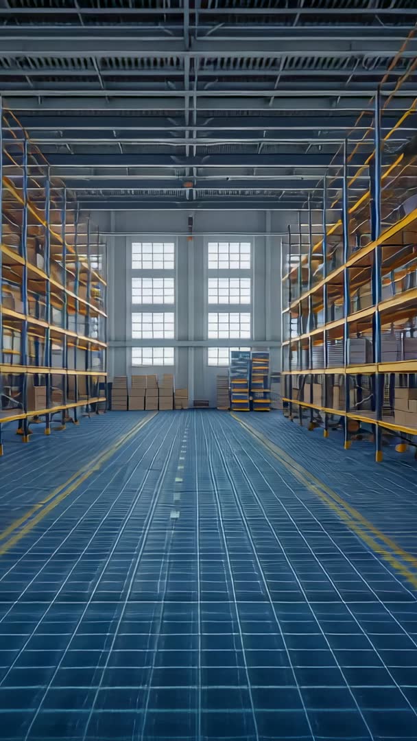AI Generated Image. Showing vertical panning shot scanning warehouse aisle with blue grid overlay for spatial mapping and digital twin workflows. Featuring symmetrical racking and pallet stacks flanking empty central aisle, high ceiling, large industrial windows providing soft backlight. Highlighting grid lines and lane markings for floor plan generation, asset tracking, and automated navigation demo. Serving as visual asset for warehouse automation presentations, logistics technology demos, inventory management tutorials, and industrial design portfolios. Pairing well with captions about supply chain optimization, robotics navigation, 3D scanning, augmented reality, and facility planning. Providing clean composition and clear perspective for cover video, social media vertical ads, training modules, and explainer videos.