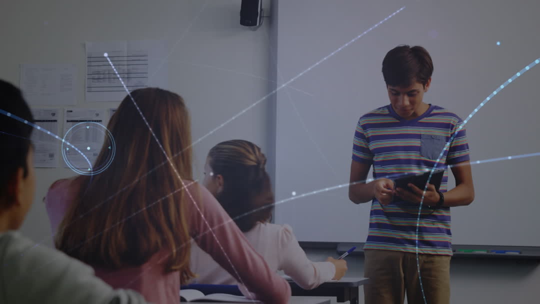 Young student in school making presentation with tablet, highlighting digital connections. This setting demonstrates the integration of technology in educational environments, conveying themes of modern education and interactive learning. Ideal for use in articles focusing on educational technology, student projects, and future learning strategies.