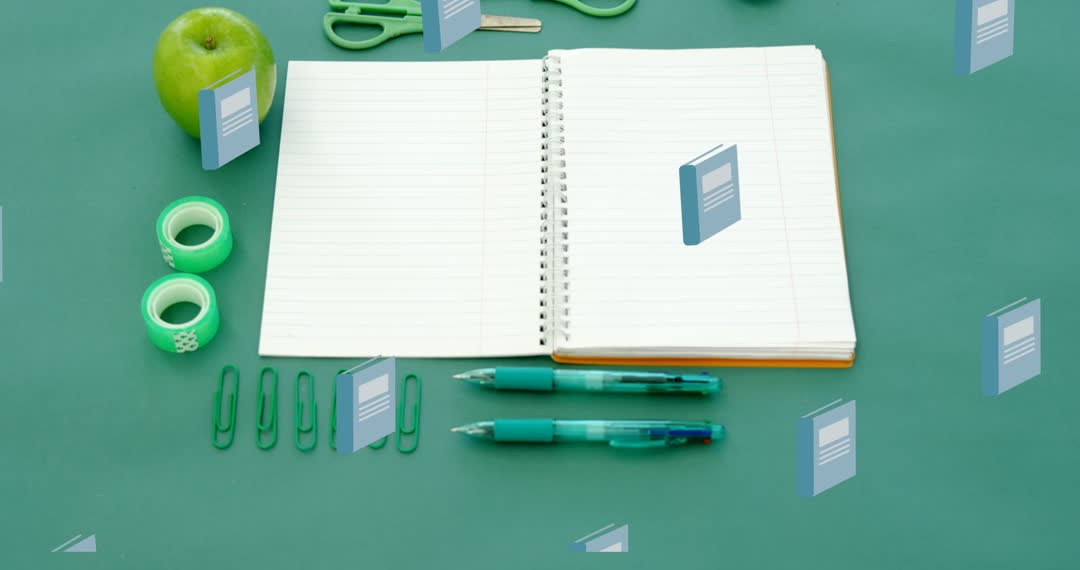 Displays a creatively arranged collection of school supplies, including a notebook, green apple, tape, scissors, pens, and paper clips on a green surface. The moving animated books add a dynamic and playful element. Ideal for educational content, school-related articles, marketing materials targeting students or teachers, or back-to-school campaign visuals.